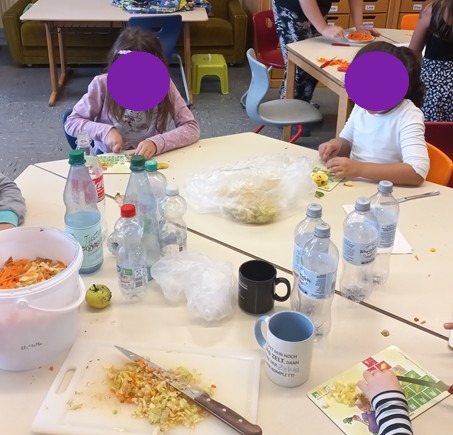 Wir bauen eine Biogasanlage. Hier schnippeln wir die Zutaten.